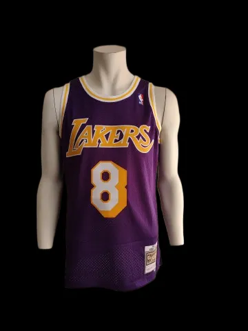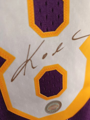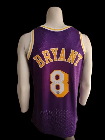Klassiek paars Los Angeles Lakers basketbalshirt, persoonlijk gesigneerd door de "Black Mamba" zelf, Kobe Bryant.